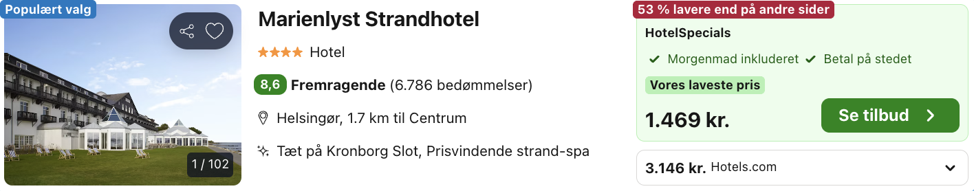 Beliggende et stenkast fra Øresund og med udsigt til det majestætiske Kronborg Slot, står Marienlyst Strandhotel som en prisbelønnet destination. Gæster kan forvente et uforglemmeligt ophold præget af luksuriøs velvære, hvilket understreges af hotellets modtagelse af Oplevelsesprisen 2022 for bedste velværeoplevelse og fornyet anerkendelse som Årets Spa ved Danish Beauty Award 2020.
