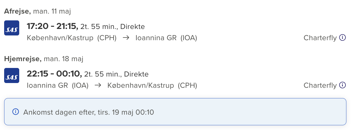 Hvis rejsen er med “Vis fly” og “Vis hotel” link, så er der tale om en sammensat rejse. Det vil sige at fly og hotel skal bestilles hver for sig. Prisen vi angiver vil dog være samlet for fly og hotel med mindre andet er angivet.