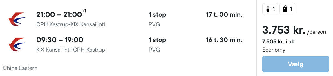 På vores flysøgningsmaskine har vi fundet billige flybilletter fra København til Osaka: