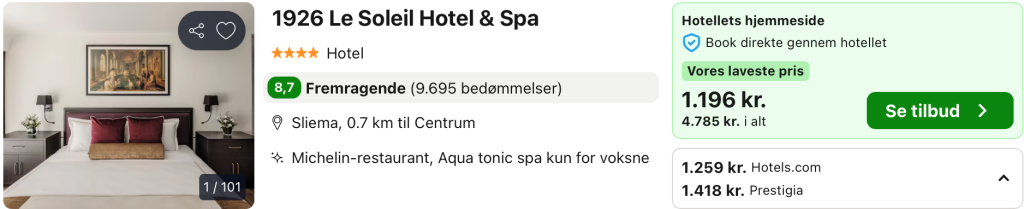 Bemærk: Den samlede pris for hotellet er 4.755,- for 2 personer i et dobbeltværelse, hvilket svarer til 2.378,- per person.
