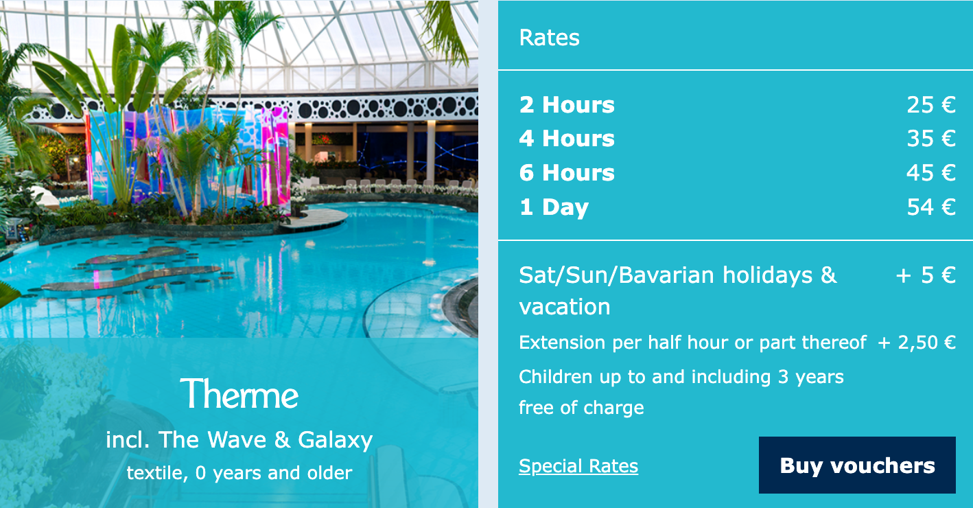 Travelcircus tilbyder pakkeløsninger, hvor du samlet kan bestille hotel og indgang til Therme Erding. Travelcircus har et stort udbud af hoteller og du kan vælge imellem mange datoer. Se mere her: