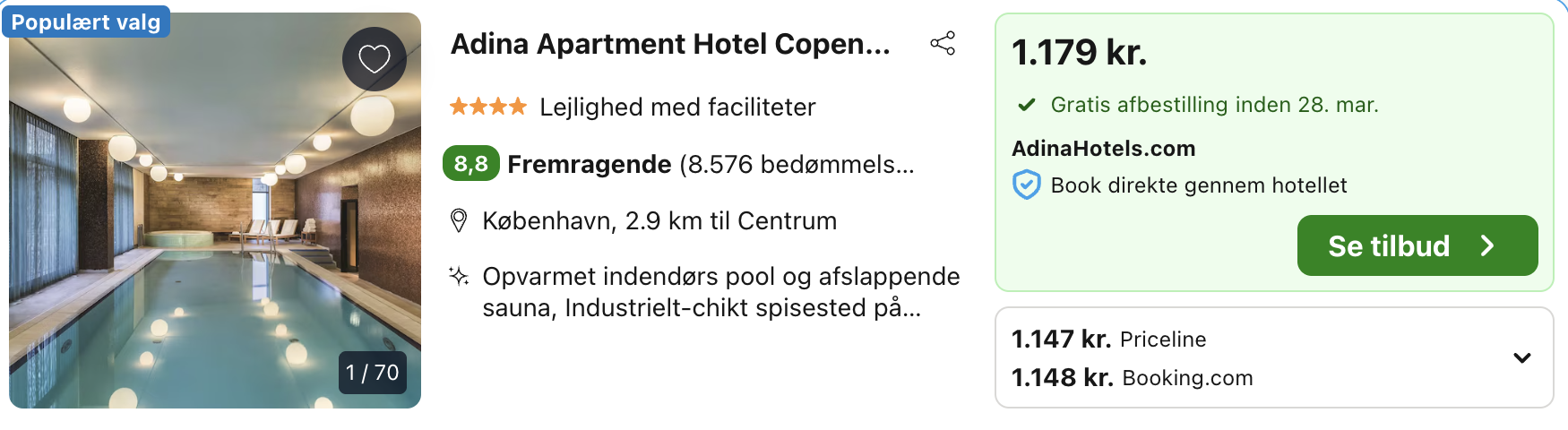 Vi har taget udgangspunkt i et ophold fra den 15. – 16. marts på Adina Apartment Hotel, der er perfekt placeret tæt på Københavns havnefront og i gåafstand til ikoniske attraktioner som Den Lille Havfrue, Kastellet og Langelinie. Du bor fredeligt, men stadig tæt på byens puls – og med både offentlig transport og cykelstier lige uden for døren er hele København let at udforske.