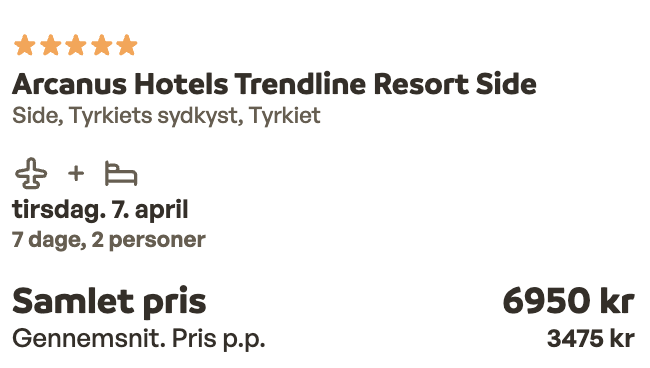 Hvis rejsen er med “Vis fly” og “Vis hotel” link, så er der tale om en sammensat rejse. Det vil sige at fly og hotel skal bestilles hver for sig. Prisen vi angiver vil dog være samlet for fly og hotel med mindre andet er angivet.