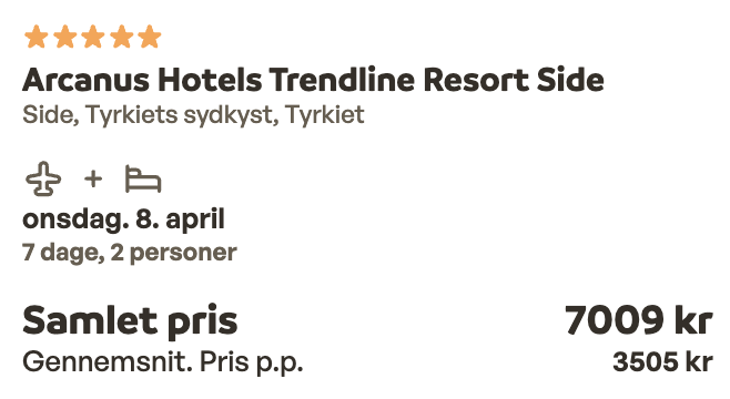 Hvis rejsen er med “Vis rejse” link, så er der tale om en pakkerejse, hvor fly og hotel bestilles på en gang.