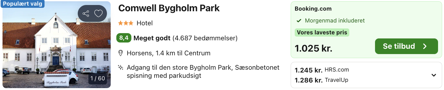 ![]() Bemærk: Den samlede pris for weekendopholdet er 1.025,- for 2 personer i et dobbeltværelse, hvilket svarer til 513,- per person.Rejs365 er ikke et rejsebureau, men en rejseside, der finder gode tilbud! – Vi modtager kommission, men det påvirker ikke din pris! Læs mere her |