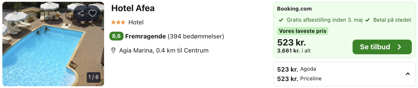 | Bemærk: Husk at lade søgningen blive helt færdig. Der kan være mindre prisforskelle på mobil og pc. Undersøg med fordel, hvor det er billigst inden bestilling. Vælg Laveste Pris på Trivago.