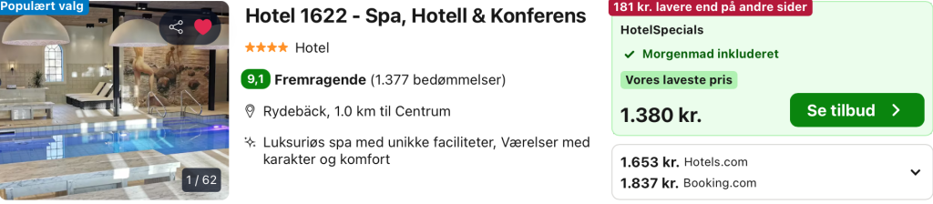 Bemærk: Den samlede pris for 2 personer i et dobbeltværelse er 1.380,- hvilket svarer til 690,- per person. Der kan være mindre prisforskelle på mobil og pc. Undersøg med fordel, hvor det er billigst inden bestilling. Rejs365 er ikke et rejsebureau, men en rejseside, der finder gode tilbud! – Vi modtager kommission, men det påvirker ikke din pris! Læs mere her