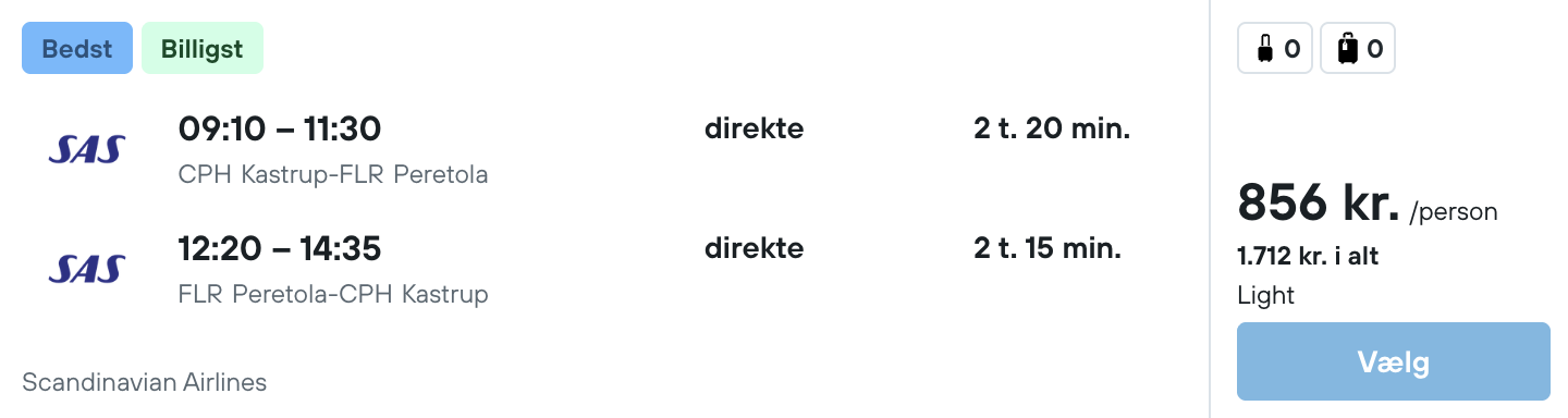 Hvis rejsen er med “Vis rejse” link, så er der tale om en pakkerejse, hvor fly og hotel bestilles på en gang.
