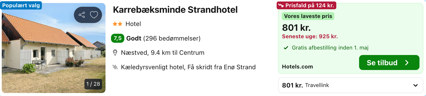Bemærk: Den samlede pris for opholdet er 801,- for 2 personer i et dobbeltværelse, hvilket svarer til 401,- per person.
