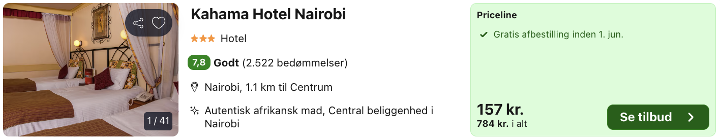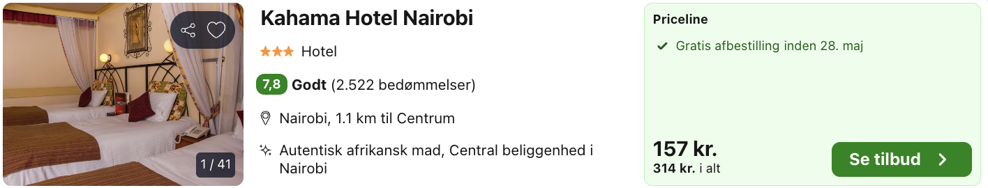 På vores flysøgningsmaskine har vi fundet billige flybilletter fra København, Billund og Aalborg til Nairobi i Kenya:
