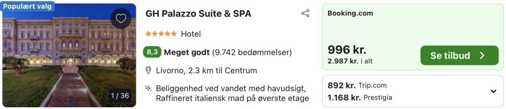 Bemærk: Husk at lade søgningen blive helt færdig. Der kan være mindre prisforskelle på mobil og pc. Undersøg med fordel, hvor det er billigst inden bestilling. Vælg “Vores laveste pris” på trivago, for at opnå den bedste pris på hotellet.