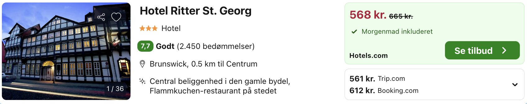 Hotellet hedder Hotel Ritter St. Georg og har til huse i en traditionel træbygning fra det 15. århundrede. Hotellet ligger centralt i Braunschweig og værelserne på stedet har rustik indretning med fritliggende træbjælker. Prisen er inkl. morgenmad.