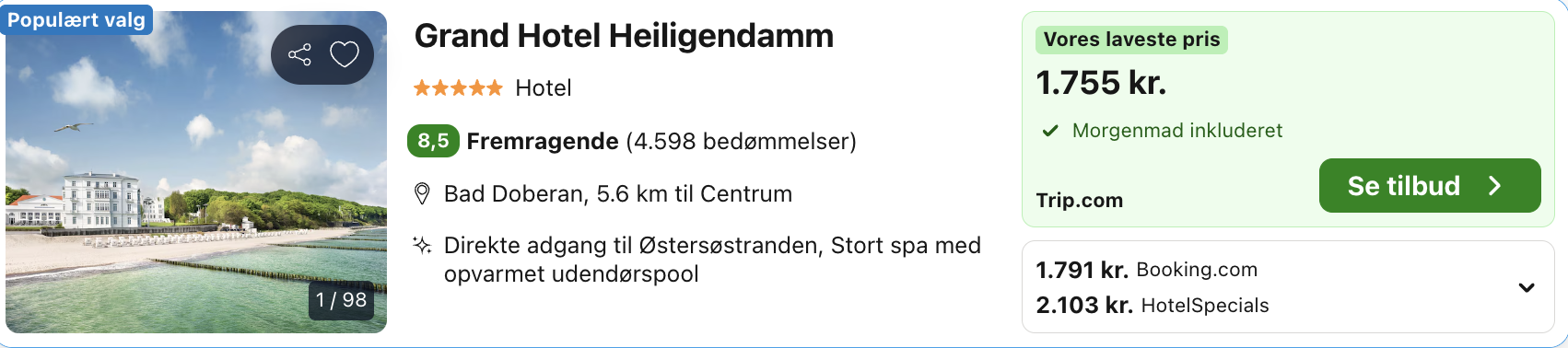 Hotellet tilbyder et væld af faciliteter, herunder et prisbelønnet spa- og wellnessområde med indendørs pool, saunaer og behandlinger, flere restauranter med gourmetoplevelser samt en hyggelig strandbar. Der er også mulighed for tennis, golf og cykelture i det naturskønne område. Grand Hotel Heiligendamm er et ideelt valg for rejsende, der søger eksklusiv afslapning, historisk atmosfære og førsteklasses service direkte ved Østersøens kyst.