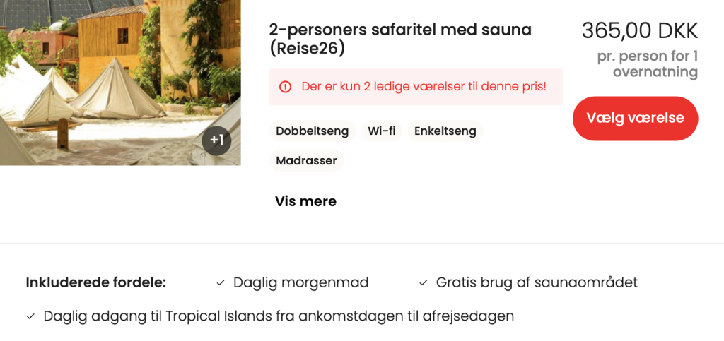 | Bemærk: Vi har taget udgangspunkt i 2 voksne i et safari telt, men man kan sagtens være et andet antal personer eller vælge en anden type indkvartering.
