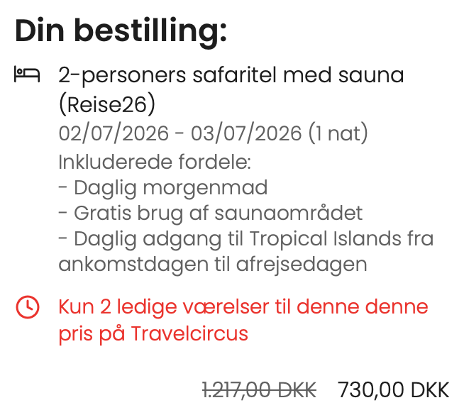 - Inklusiv overnatning i Tropical Islands i Safari-telt, Premium-telt, Premium-dobbeltværelse, Premium-familieværelse eller Woodland Home)