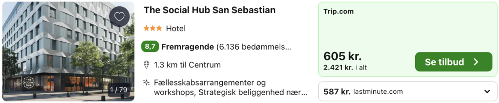 Stedet fungerer som både hotel, co-working space og socialt samlingspunkt, hvor gæster kan mødes, arbejde eller slappe af. Der er tagterrasse med pool og udsigt over San Sebastián, et fitnesscenter, restaurant og bar – alt sammen i en moderne og inspirerende atmosfære. The Social Hub lægger vægt på bæredygtighed og fællesskab og tiltrækker både lokale og internationale gæster. Med sin centrale placering og sit fokus på livsstil og socialt samvær er The Social Hub San Sebastián et ideelt valg for dem, der vil opleve byen på en moderne, autentisk og energifyldt måde.