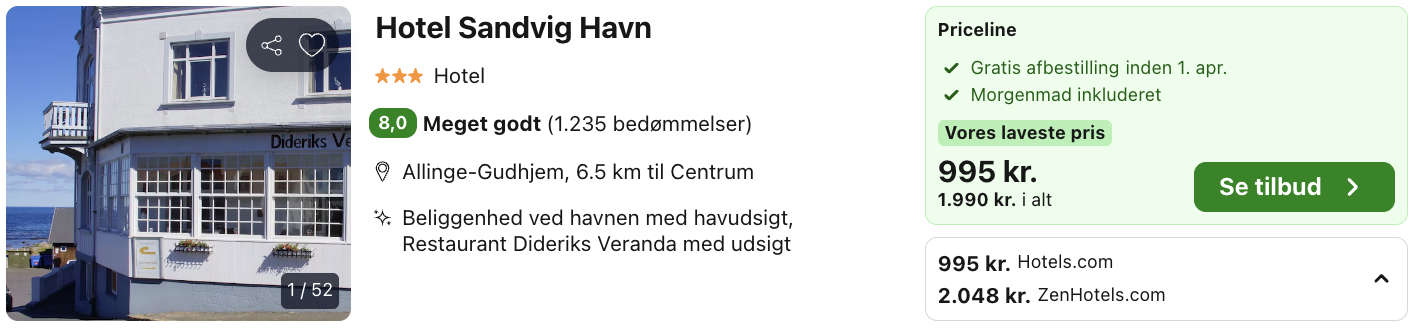 ![]() Bemærk: Den samlede pris for opholdet er 1.900,- for 2 personer hvilket svarer til 995,- per person. Der kan være mindre prisforskelle på mobil og pc. Undersøg med fordel, hvor det er billigst inden bestilling. Rejs365 er ikke et rejsebureau, men en rejseside, der finder gode tilbud! – Vi modtager kommission, men det påvirker ikke din pris! Læs mere her