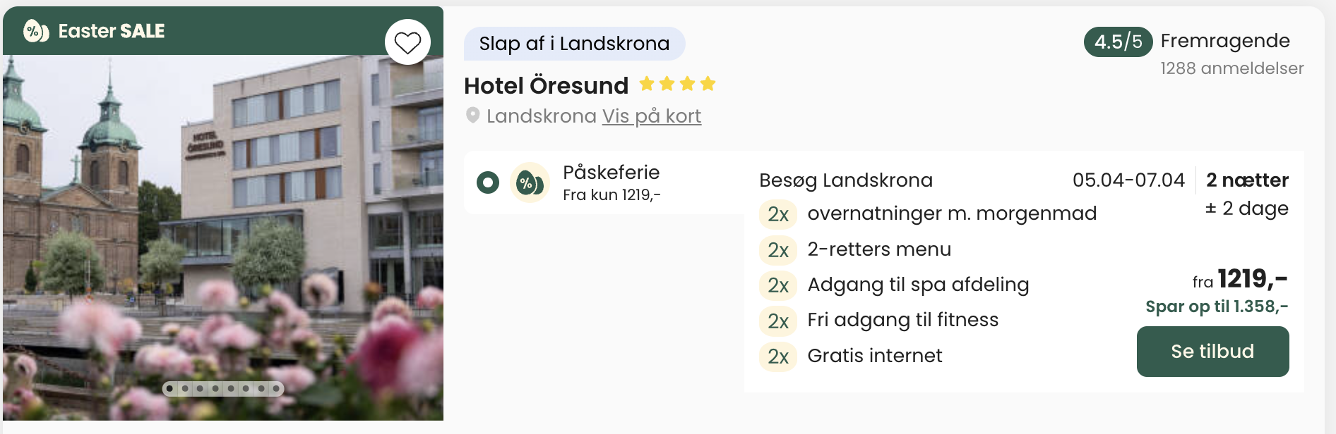Vi har taget udgangspunkt i et ophold fra den 4. – 6. april. Der er flere datoer til samme pris.