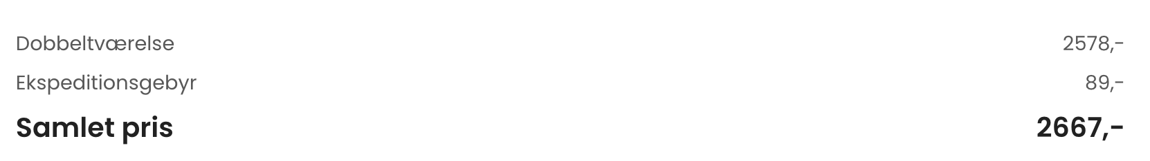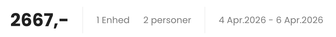 Bemærk: Den samlede pris for opholdet er 2.667,- for 2 personer i et dobbeltværelse, hvilket svarer til 1.334,- per person inkl. obligatorisk ekspeditionsgebyr på 89,- per booking.