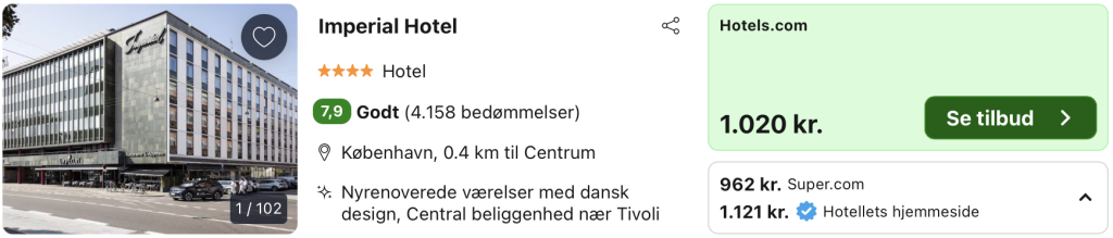 Vi har taget udgangspunkt i et ophold fra den 22. – 23. marts på Imperial Hotel. I 1950’erne oplevede danske håndværkere, møbelsnedkere og designere en blomstringsperiode. Det var et årti, hvor en række ikoniske design fandt vej til danske hjem og erobrede folks hjerter. Denne æra afspejles tydeligt på Imperial Hotel, der blev opført i 1958. I dag står hotellet som et smukt renoveret, klassisk designikon. Det er ikke blot et symbol på dette betydningsfulde årti, men også et globalt samlingspunkt. Her kan vi vække til live et designudtryk, der efterlader indtryk! På Imperial Hotel kan du blandt andet stifte bekendtskab med danske designlegender som Verner Panton, Fritz Hansen og Morten Engelbrecht.