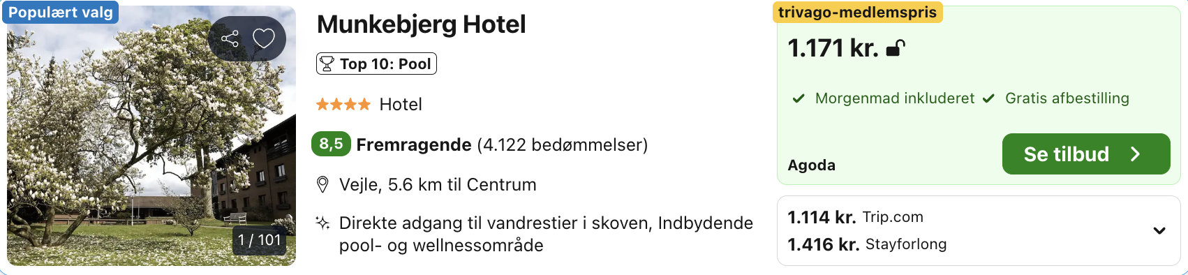 Munkebjerg Hotel er en elegant perle beliggende midt i naturskønne omgivelser ved Vejle Fjord. Hotellet er kendt for sin unikke placering omgivet af skov og med udsigt over vandet, hvilket gør det til en ideel destination for dem, der søger afslapning, forkælelse og smukke omgivelser.
