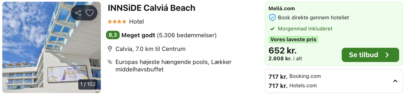 Hvis rejsen er med “Vis fly” og “Vis hotel” link, så er der tale om en sammensat rejse. Det vil sige at fly og hotel skal bestilles hver for sig. Prisen vi angiver vil dog være samlet for fly og hotel med mindre andet er angivet.