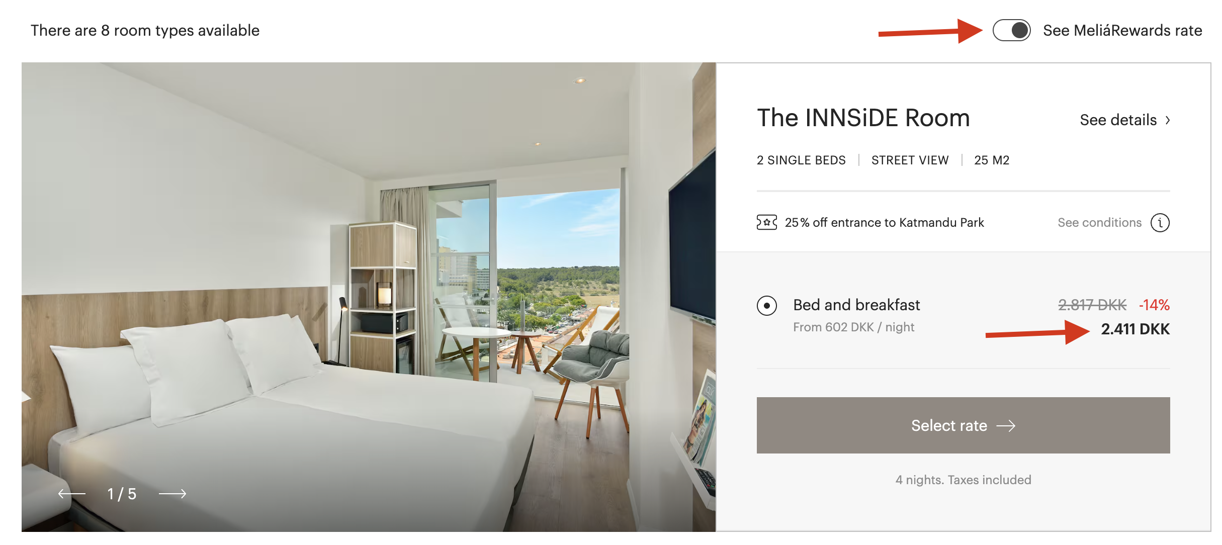 | Bemærk: Den samlede pris for hotellet er 2.411,- for 2 personer i et dobbeltværelse, hvilket svarer til 1.206,- per person. |