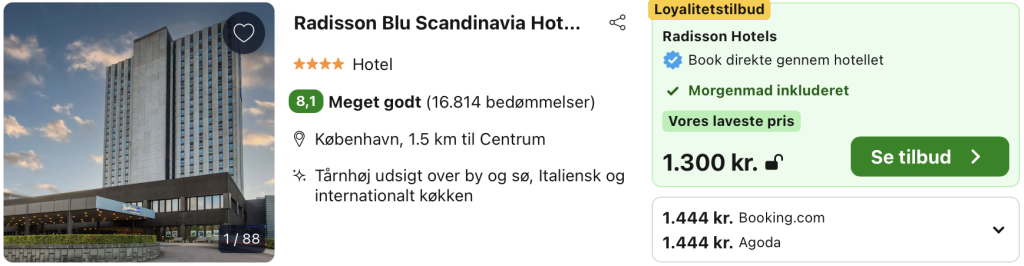 Vi har taget udgangspunkt i et ophold fra den 5. – 6. april på Radisson Blu Scandinavia Hotel, Copenhagen, der er et moderne og luksuriøst hotel beliggende i hjertet af København, tæt på byens største seværdigheder, shoppingområder og kulturliv. Hotellet kombinerer stilfuld indretning med fremragende service og tilbyder et ideelt valg for både forretningsrejsende og turister, der ønsker at opleve byen i komfortable omgivelser.