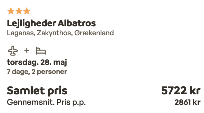 Hvis rejsen er med “Vis fly” og “Vis hotel” link, så er der tale om en sammensat rejse. Det vil sige at fly og hotel skal bestilles hver for sig. Prisen vi angiver vil dog være samlet for fly og hotel med mindre andet er angivet.
