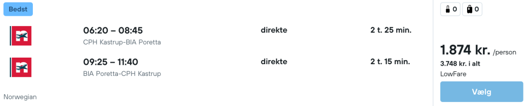 Bemærk: Husk at lade søgningen på vores flysøgemaskine blive helt færdig. Der kan være mindre prisforskelle på mobil og pc. Undersøg med fordel, hvor det er billigst inden bestilling.