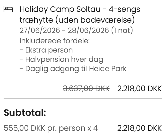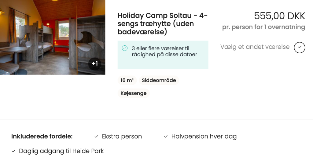 Vi har taget udgangspunkt i et ophold i Holiday Camp Soltau – i en træhytte til 4 personer. Ved et ophold i Holiday Camp er der både inkluderet adgang til Heide Park på ankomstagen samt på afrejsedagen. Derudover er opholdet med halvpension, hvor der indgår ikke alkoholiske drikke til måltiderne samt en snack kupon til brug i parken. Slutrengøringen er ligeledes inkluderet i prisen.