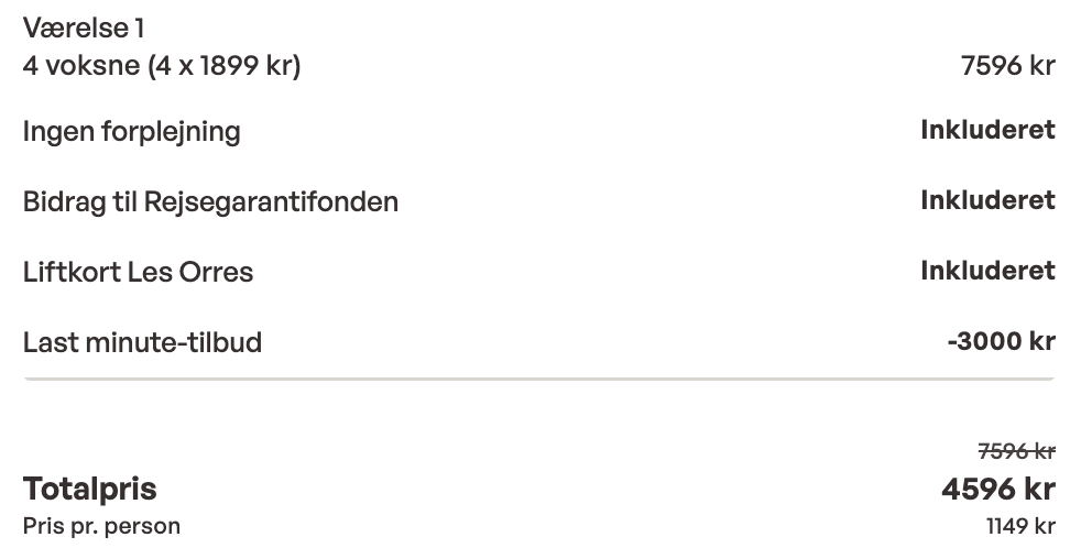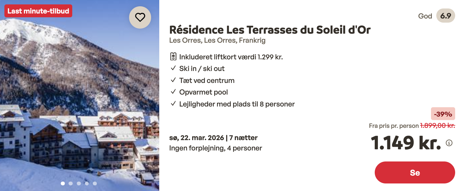 6-dages liftkort (søndag til fredag, kan ændres) er inkluderet (værdi: 1.299,- per person). Det er muligt at tilkøbe flere dage, såfremt det ønskes.