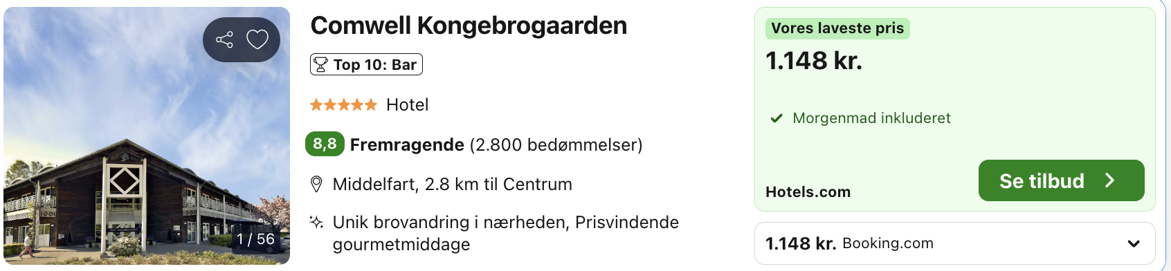 Bemærk: Den samlede pris for opholdet er 1.148,- for 2 personer i et dobbeltværelse, hvilket svarer til 574,- per person. Der kan være mindre prisforskelle på mobil og pc. Undersøg med fordel, hvor det er billigst inden bestilling. Rejs365 er ikke et rejsebureau, men en rejseside, der finder gode tilbud! – Vi modtager kommission, men det påvirker ikke din pris! Læs mere her |