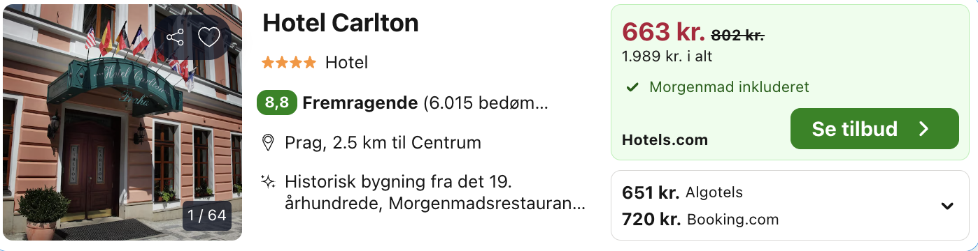 Hvis rejsen er med “Vis fly” og “Vis hotel” link, så er der tale om en sammensat rejse. Det vil sige at fly og hotel skal bestilles hver for sig. Prisen vi angiver vil dog være samlet for fly og hotel med mindre andet er angivet.