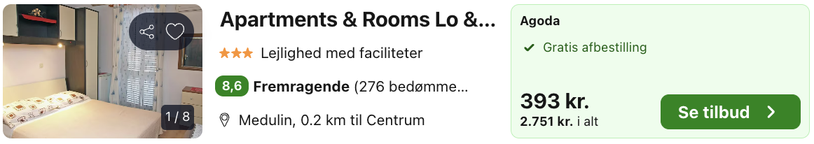 Apartments & Rooms Lo & Mar ligger i Medulin nær Pula og er et hyggeligt og afslappende sted at bo på den kroatiske Istrien-kyst. Her bor du tæt på smukke strande, krystalklart vand og med nem adgang til både Medulins ferieatmosfære og Pulas historiske seværdigheder, herunder den berømte romerske arena.