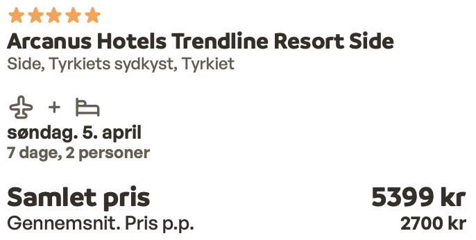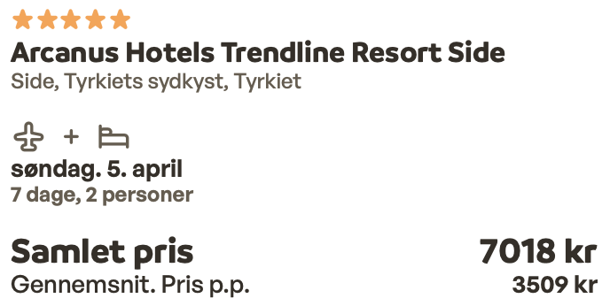 Hvis rejsen er med “Vis fly” og “Vis hotel” link, så er der tale om en sammensat rejse. Det vil sige at fly og hotel skal bestilles hver for sig. Prisen vi angiver vil dog være samlet for fly og hotel med mindre andet er angivet.
