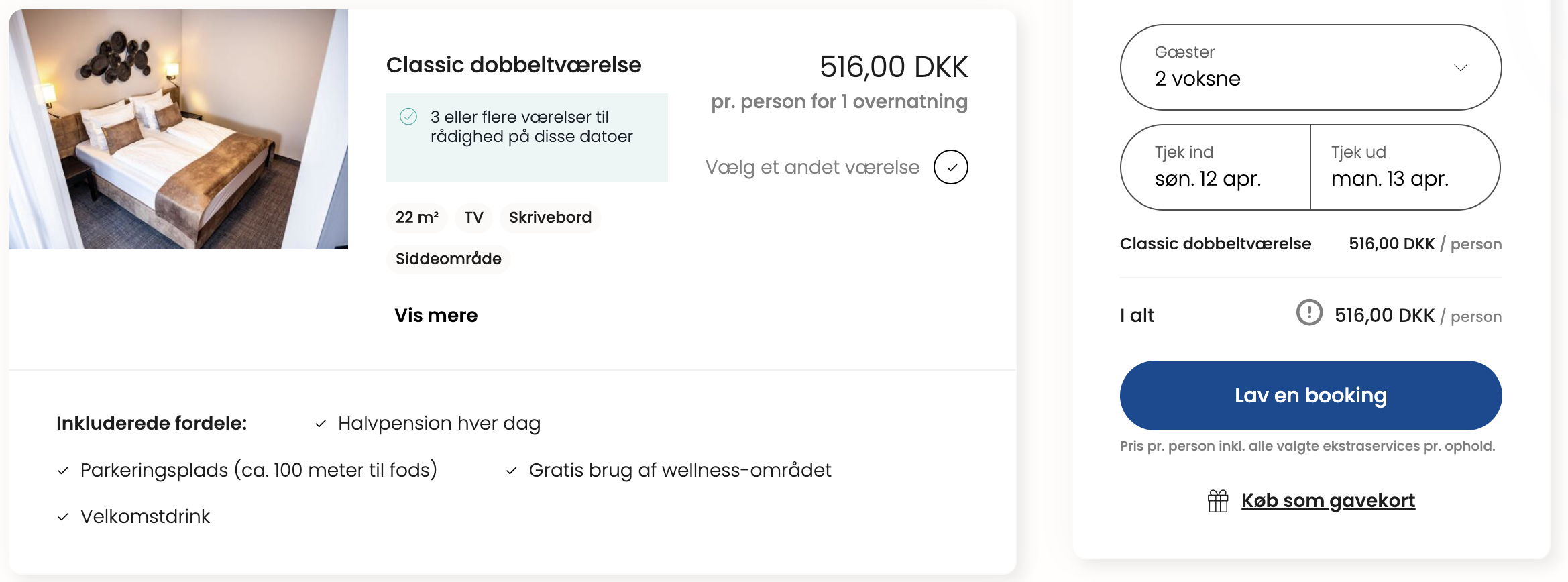 ![]() Bemærk: Den samlede pris for opholdet er 1.032,- for 2 personer i et dobbeltværelse, hvilket svarer 516,- per person. Vi har taget udgangspunkt i et ophold fra den 12. – 13. april. Rejs365 er ikke et rejsebureau, men en rejseside, der finder gode tilbud! – Vi modtager kommission, men det påvirker ikke din pris! Læs mere her |