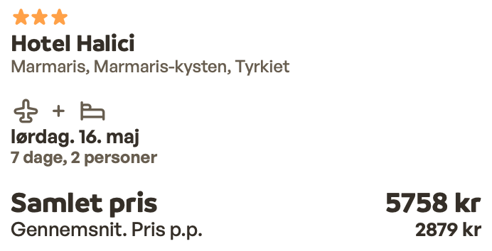 Hvis rejsen er med “Vis fly” og “Vis hotel” link, så er der tale om en sammensat rejse. Det vil sige at fly og hotel skal bestilles hver for sig. Prisen vi angiver vil dog være samlet for fly og hotel med mindre andet er angivet.