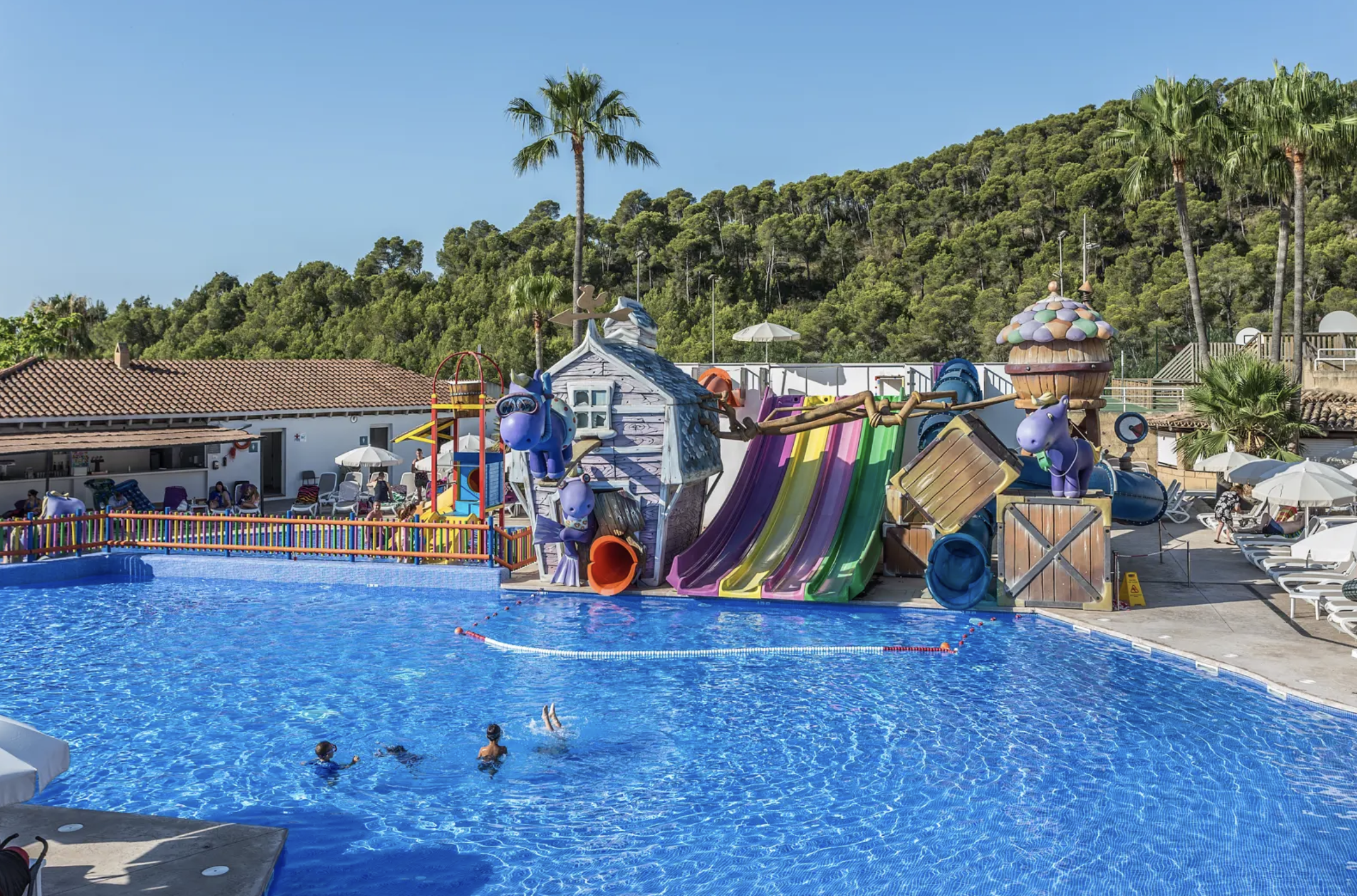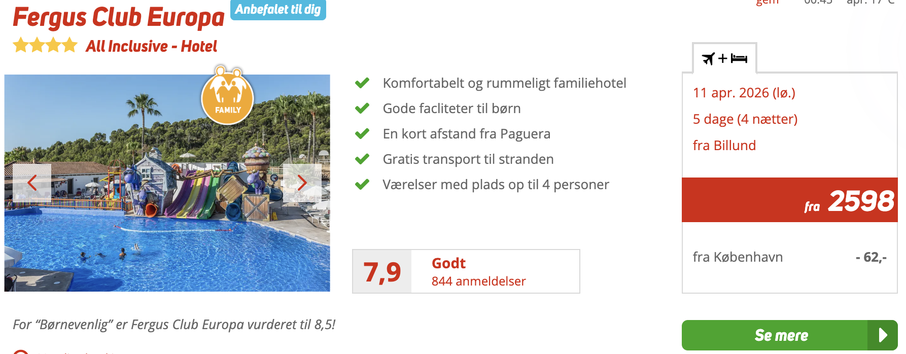Fergus Club Europe byder på mange faciliteter for unge som gamle, med indtil flere pools, vandrutsjebaner, restauranter og sportsaktiviteter. Til børnene er der bl.a. miniklub (her tales ikke dansk), legeplads og ikke mindst et omfattende underholdningsprogram. Børnene kan ganske gratis slubre is i sig om eftermiddagen, da opholdet er med All Inclusive. All Inclusive inkluderer også alle måltider og drikkevarer.