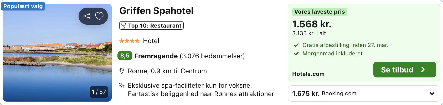 Griffen Spa Hotel er Bornholms flotte spahotel med Østersøen i forhaven. Forkæl dig selv med lækre moderne omgivelser, stort spa & wellnessområde, og en særdeles populær restaurant, hvor maden lever op til den imponerende udsigt. En udsigt der er så smuk, at den er kåret som en af Bornholms bedste udsigter.