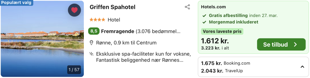 Griffen Spa Hotel er Bornholms flotte spahotel med Østersøen i forhaven. Forkæl dig selv med lækre moderne omgivelser, stort spa & wellnessområde, og en særdeles populær restaurant, hvor maden lever op til den imponerende udsigt. En udsigt der er så smuk, at den er kåret som en af Bornholms bedste udsigter.