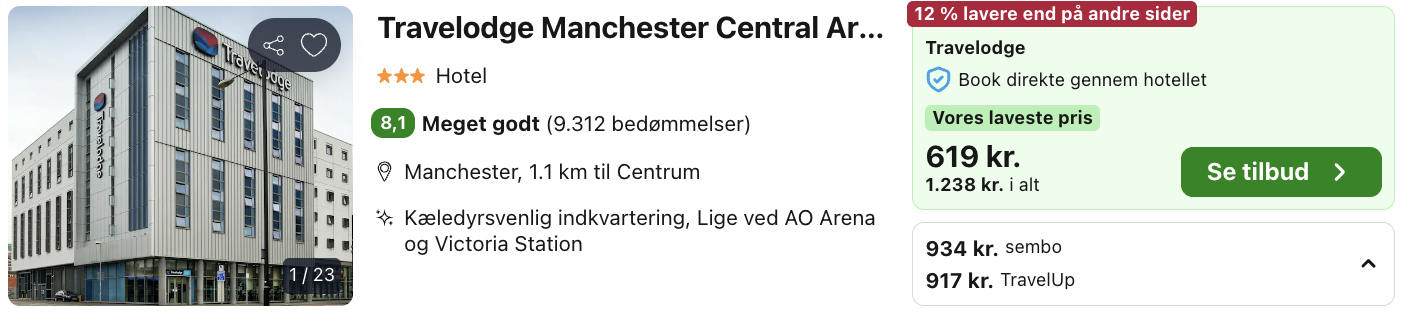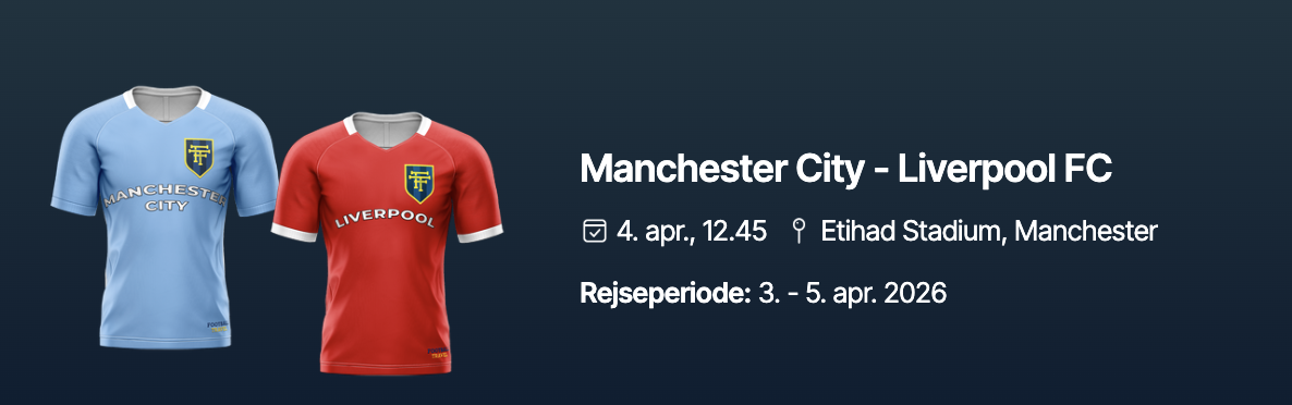 | Bemærk: Du bestiller din fodboldrejse hos Footballtravel.dk. Vi har taget udgangspunkt i en pakke der inkluderer billet til kampen mellem Manchester City og Liverpool. Fly og hotel skal bestilles seperat.Rejs365 er ikke et rejsebureau, men en rejseside, der finder gode tilbud! – Vi modtager kommission, men det påvirker ikke din pris! Læs mere her |