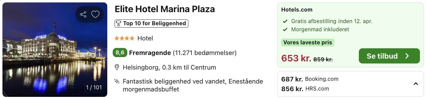 Ophold på Elite Hotel Marina Plaza i Helsingborg for kun 327,- per person inkl. morgenmad og super beliggenhed direkte ud til vandet!