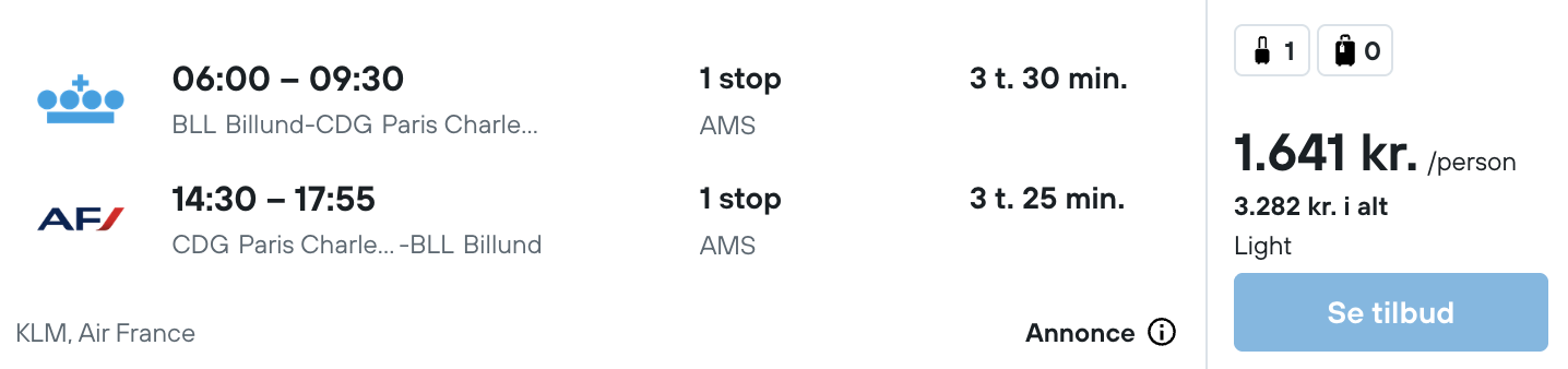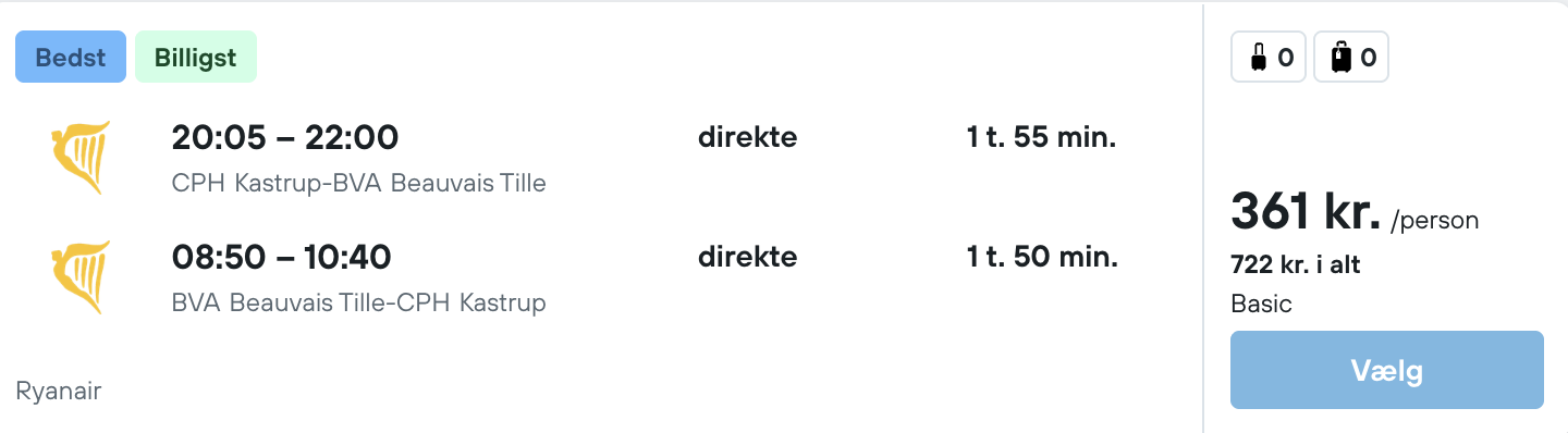 Tjek altid datoerne for at se om de passer sammen før du bestiller, da vi kan have begået fejl. Tjek derudover også prisen på begge ting før du bestiller det ene, da prisen kan have ændret sig. Der kan også være små variationer i prisen mellem mobil og pc.