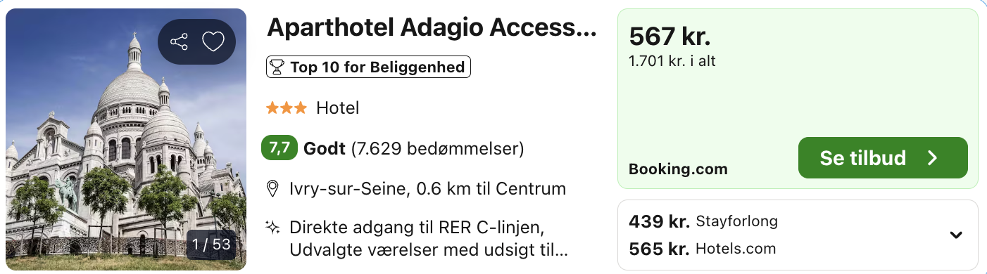 | Bemærk: Der kan være mindre prisforskelle på mobil og pc. Undersøg med fordel, hvor det er billigst inden bestilling. Vælg “Vores laveste pris” på trivago, for at opnå den bedste pris på hotellet.