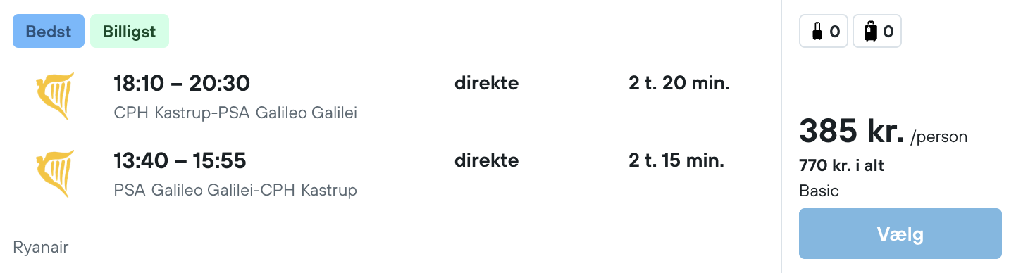 Flyprisen inkluderer kun en lille taske, men bagage kan tilkøbes.