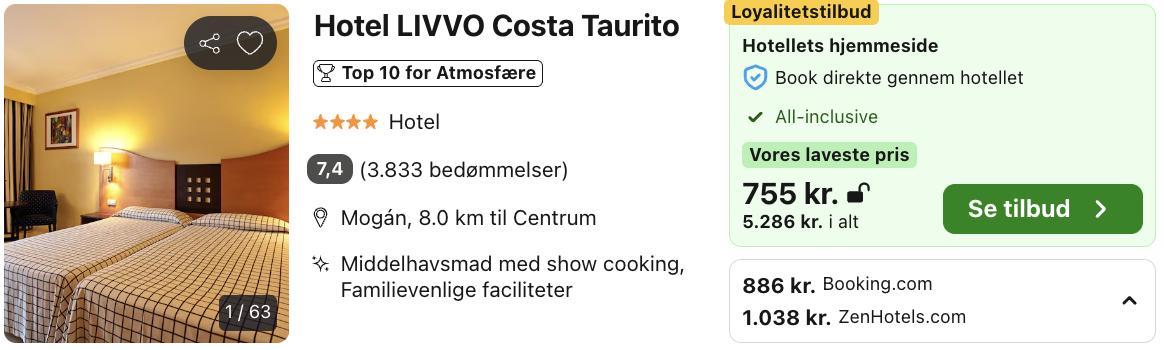| Bemærk: Hotellet koster 5.286,- for to personer i et dobbeltværelse, hvilket svarer til 2.643,- per person. |