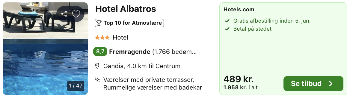 Hvis rejsen er med “Vis fly” og “Vis hotel” link, så er der tale om en sammensat rejse. Det vil sige at fly og hotel skal bestilles hver for sig. Prisen vi angiver vil dog være samlet for fly og hotel med mindre andet er angivet.