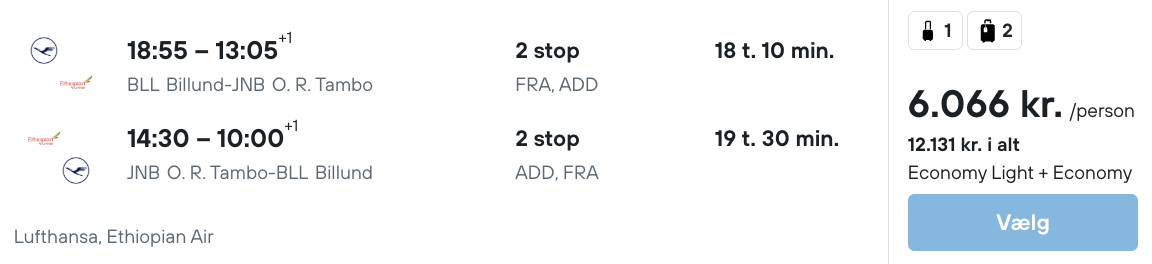 På vores flysøgemaskine har vi fundet billige flybilletter fra København og Billund til Johannesburg.