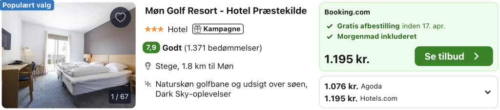 Vi har taget udgangspunkt i et ophold fra den 19. – 20. april på Møn Golf Resort – Hotel Præstekilde, der ligger i naturskønne omgivelser på det vestlige Møn, omgivet af åbne marker, skov og resortets egen golfbane. Hotellet har en rolig og afslappet atmosfære med lyse værelser indrettet i enkel, nordisk stil, hvor komfort og udsigt til naturen er i fokus. Stemningen er uformel og indbydende, hvilket gør stedet velegnet til både golfophold, par og gæster, der ønsker fred og natur tæt på.